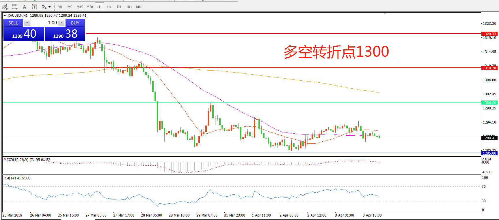 4小时图图看,金价跌破千三心理关口,整体形态偏弱。目前整体位于低位呈现窄幅震荡形态。MACD红柱增加,RSI指标拐头,日内有延续震荡可能,静待非农。