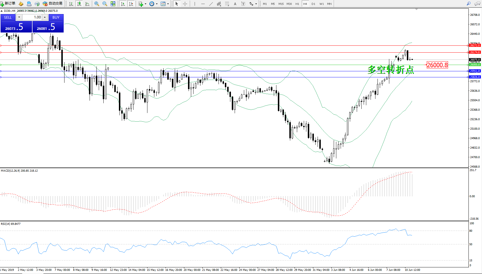 道琼斯指数DJ30—— 4小时K线图显示: