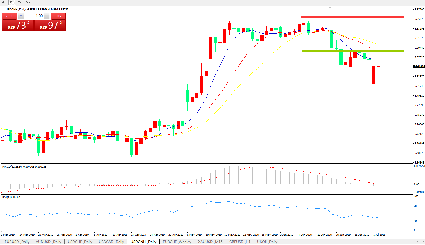 技术面简析:日线呈有序空头排列MACD下穿0轴且动能柱持续放量RSI逐步走低,预计汇价大概率将进一步走低,警惕贸易谈判可能出现的反复
