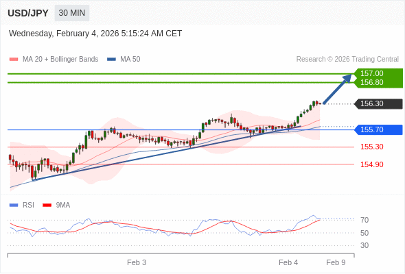 在 155.70 之上,看涨,目标价位为 156.80 ,然后为 157.00 。