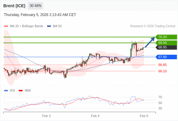 在 67.80 之上,看涨,目标价位为 69.50 ,然后为 70.20 。