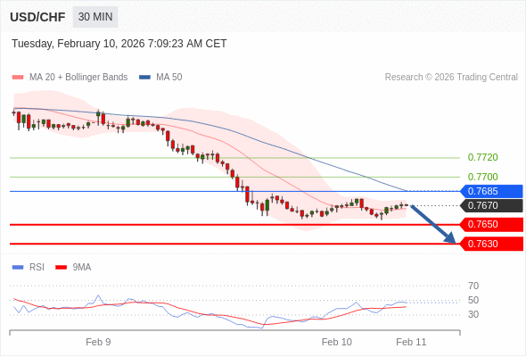 在 0.7685 之下,看跌,目标价位为 0.7650 ,然后为 0.7630 。
