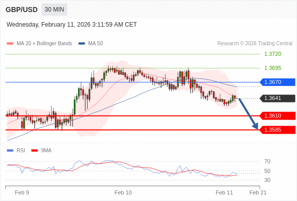 在 1.3670 之下,看跌,目标价位为 1.3610 ,然后为 1.3585 。