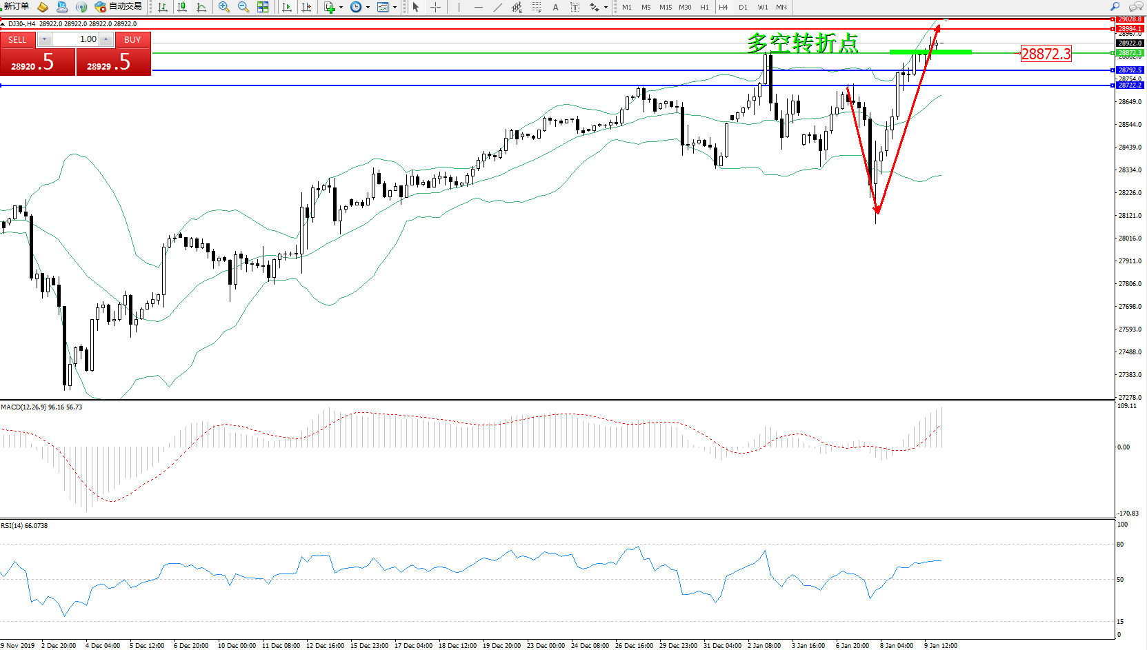 道琼斯指数DJ30—— 4小时K线图显示: