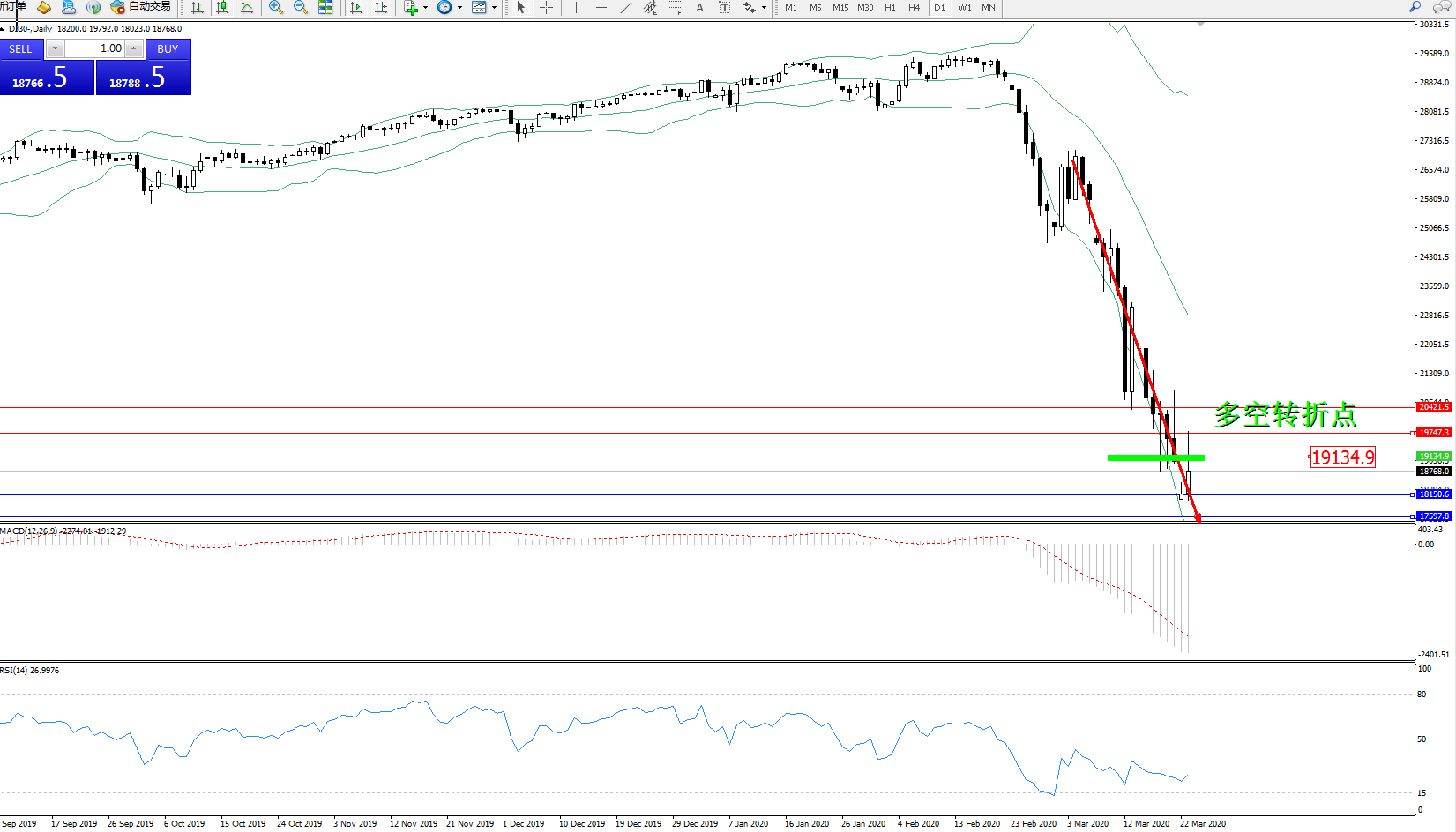 交易策略:19134下方看跌,目标18150、17597