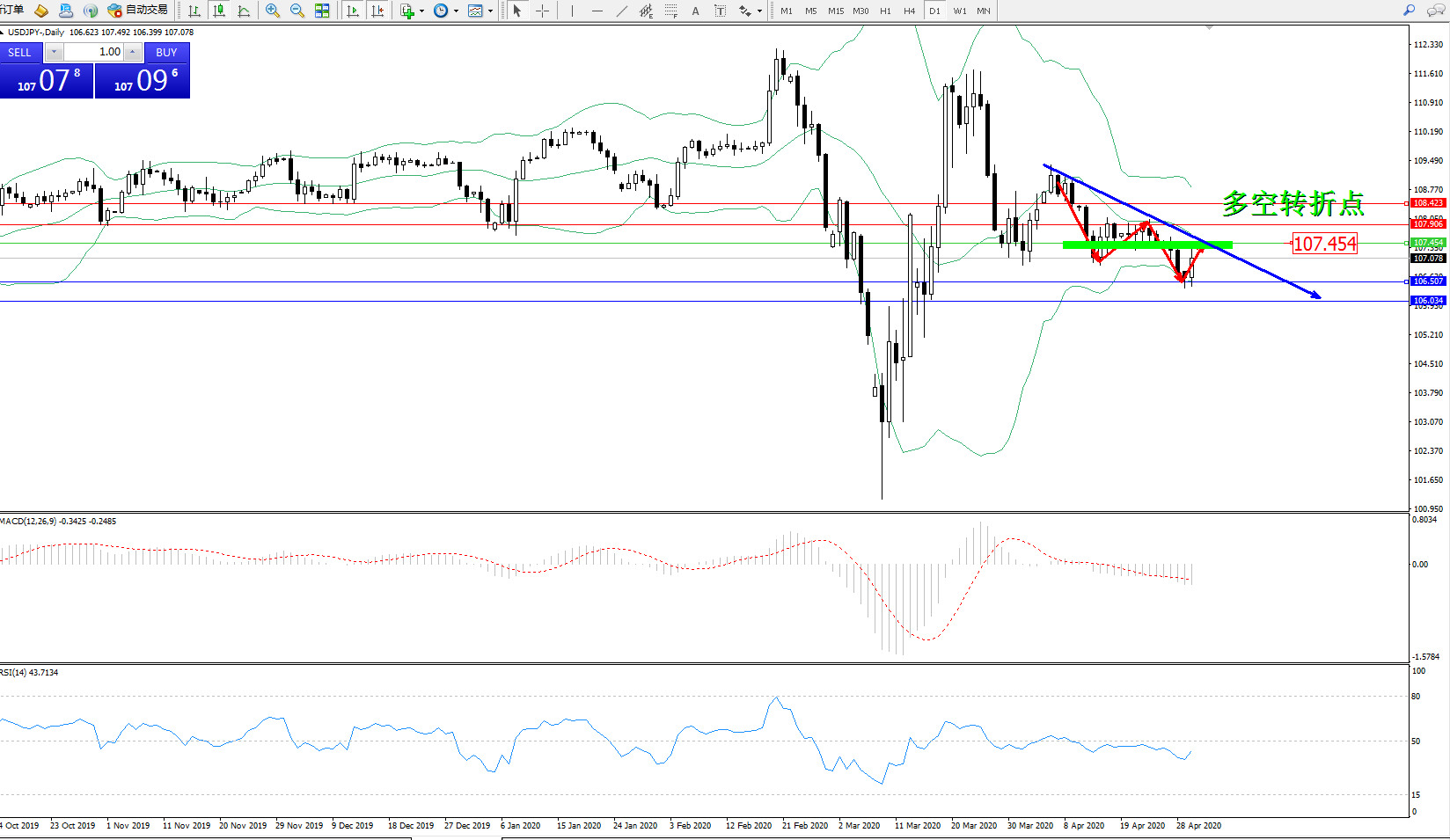 交易策略:107.454下方看跌,目标106.507、106.034