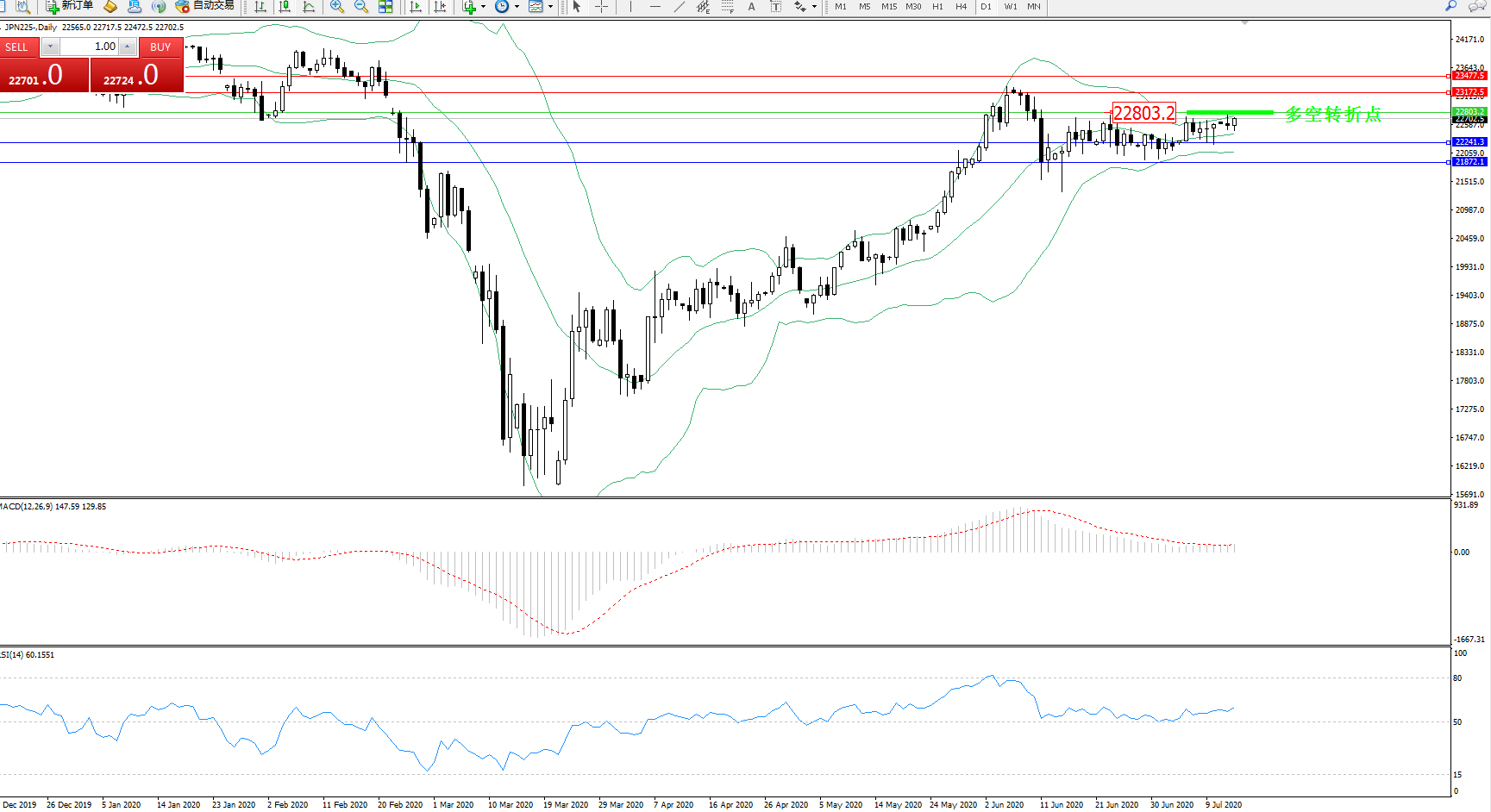 日经225指数714日(周二)收盘下跌215.24点,跌幅0.94%,报22569.50点。中国进出口数据整体向好,但不敌风险偏好情绪回落,亚洲股市大幅回落,近期美股、非美品种的同向波动需要出现变化,如果美国经济好转,将撤出部分为应对新冠疫情推出的刺激措施。由于本轮上涨行情已经在尾声阶段,因此上行的速度和力度都有了明显的放缓,这种情况下,市场会呈现涨三跌一甚至跌二的状况。持续的单边上涨或者下跌都不太可能出现。据日本广播协会(NHK14日报道,为了放宽因为防范新冠疫情而采取的外国人入境限制措施,有消息显示日本政府正在研究以欧洲和美国等国的企业经营人等为对象,在时间短、人员少、且接受核酸(PCR)检测等的前提下,允许其入境日本。