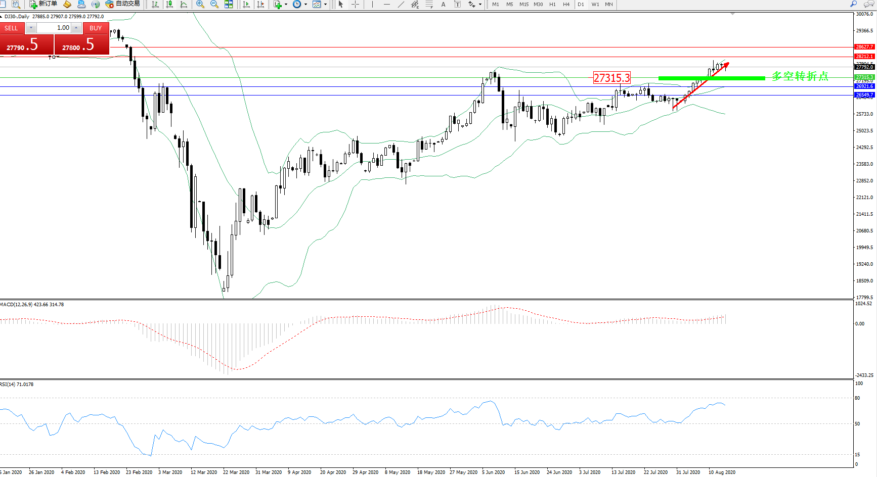 道琼斯指数8月14日(周五)收盘上涨34.30点,涨幅0.12%,报27931.02点。美国股市收盘涨跌互现,美国7月零售销售较前月增加1.2%,市场预期增长1.9%,美元未对该数据做出反应。当日出炉的美国消费者信心和工业生产等其他数据也几乎未对美元产生影响。由于美国确诊病例激增,可能导致限制措施实施时间延长,这有可能对人们的活动造成更长时间的拖累,从而意味着美国的复苏速度比其他发达经济体要慢。白宫与民主党的刺激法案谈判仍然僵持。服务业正试图复苏,但远未达到疫情爆发前的水平。经济正在逐步恢复健康,不过最近的一些数据显示,各领域增长的步伐参差不齐。现在所有人都在关注华府,寻找有关新刺激法案谈判的线索。