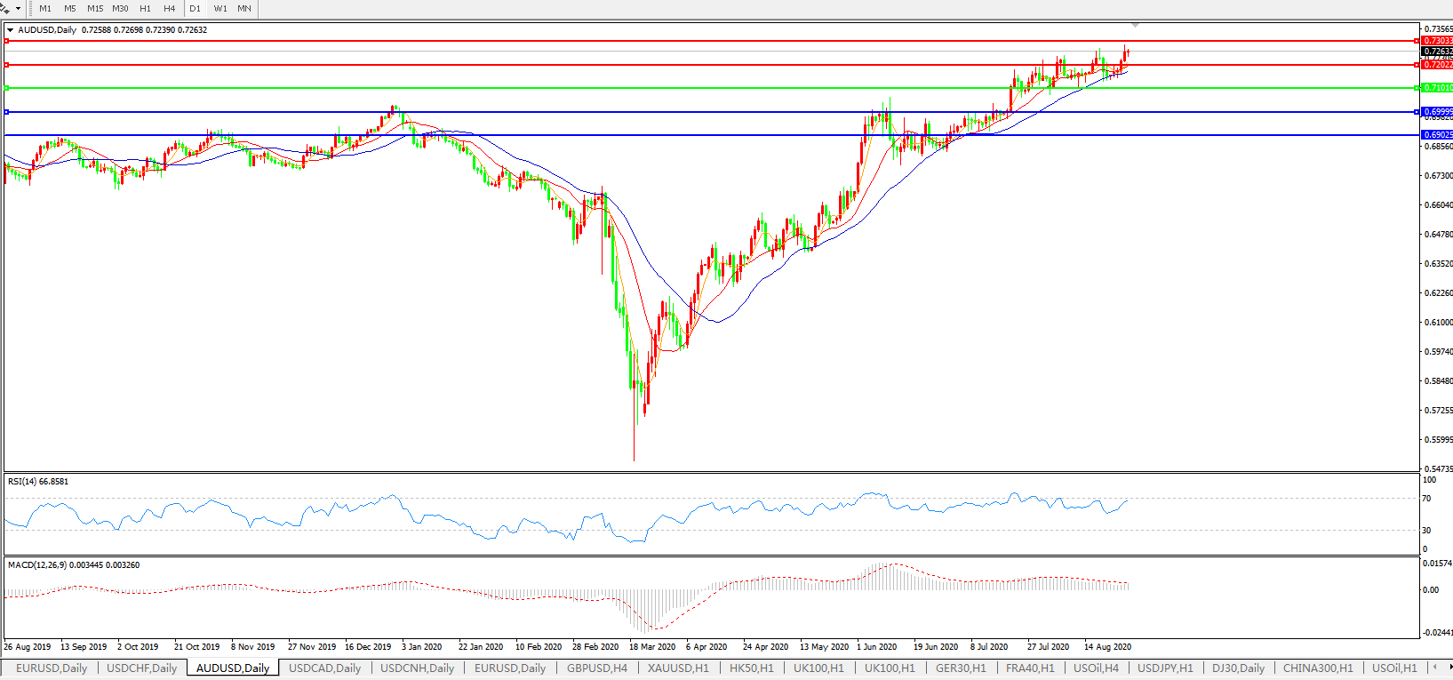 瑞士信贷表示,澳元兑美元周三(8月26日)强势上涨突破0.7216的区间中部,焦点转向更广阔的区间高点0.7276/95,如预期守住21日移动均线0.7172这一关键支持后急速上涨,虽然反弹但短期动能依然疲弱令人担忧,不过位于0.7172上方依然看涨,自4月以来一直守住该点位,突破短期阻力0.7207/16后焦点转向近期高点0.7276和2019年高点0.7295,升破2019年高点0.7276/95将强化上涨动能,打开升向0.7394的大门,中期目标依然为0.7574/7638;但若收于0.7172下方,短期前景将转为看跌,跌破0.7140/32将形成小型顶部,后市目标依次下看0.7109和0.7076/63。