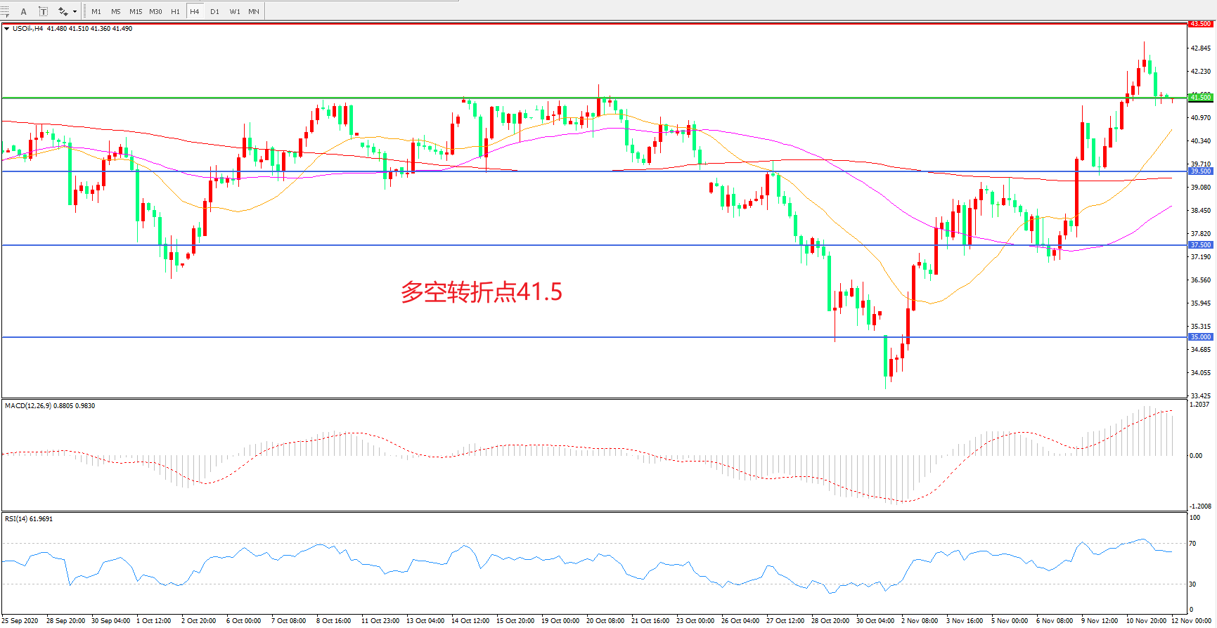 周三(11月11日),虽然疫苗消息带来的上升动力减弱,但市场预期供应的压力会缓和,美国WTI原油回吐多数涨幅后,收报41.50美元/桶。近期有多名OPEC+代表的消息称,OPEC+产油国本月末在维也纳举行的会议将侧重讨论,是否将定于明年1月开始实行的缩减减产规模时间推迟3到6个月,能否真正将减产的想法落实是市场关注的焦点。