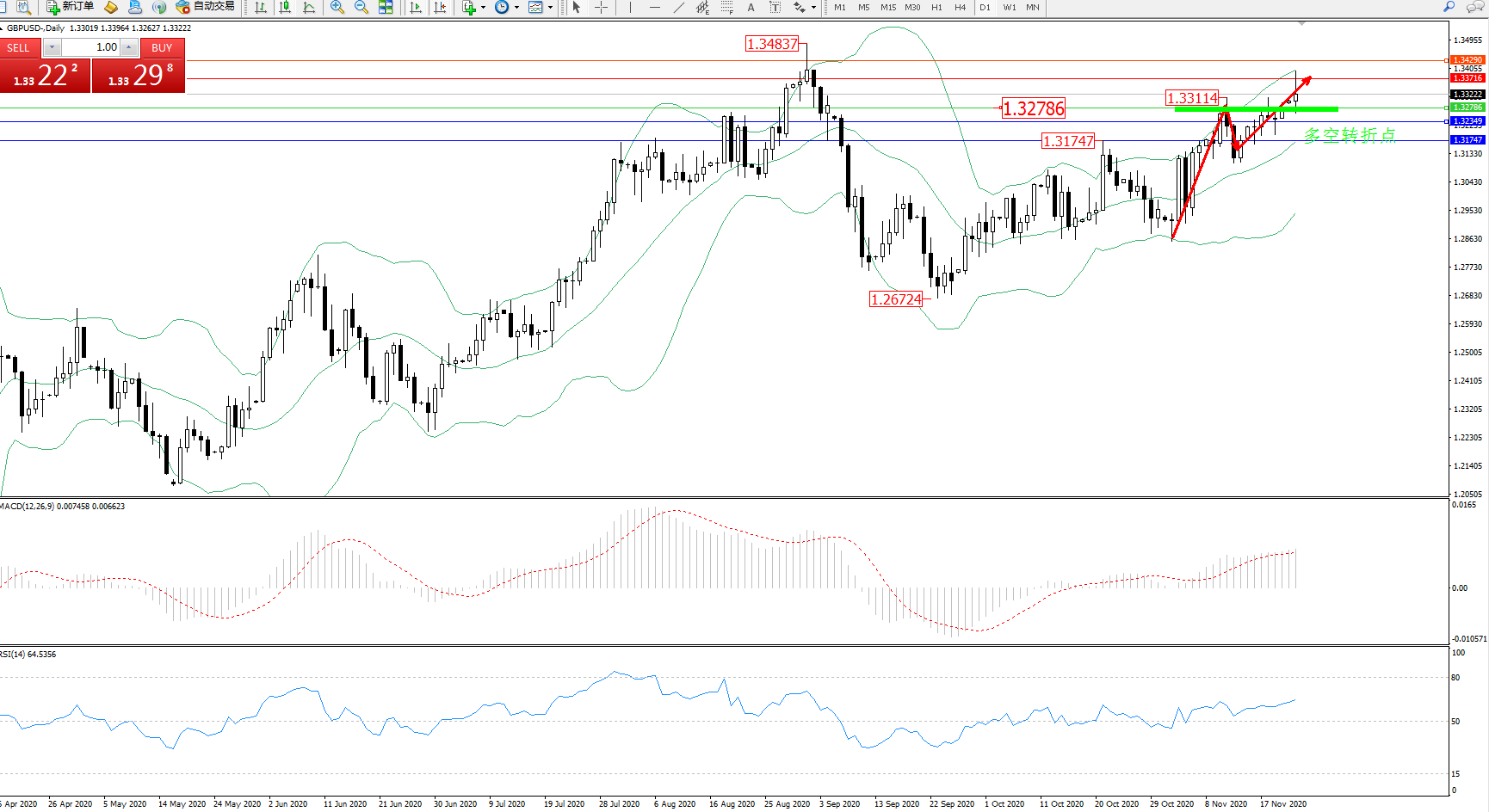 交易策略:1.32786上方看涨,目标1.33716、1.34290