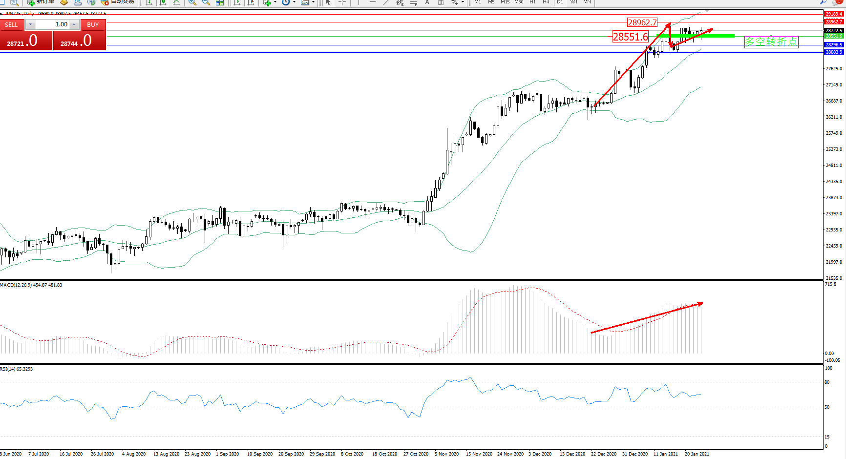 技术点评:多头动力延续布林带指标通道中上轨区间持续震荡上扬态势良好,高位抵达28962位置节点后遇阻出现短暂回撤,然度多头动力未见减弱走势,有继续拉升上扬态势,布林带指标呈收口向上移动走势持续中,MACD指标处于多头区域维持震荡拉升走势中,RSI指标处于50均衡线上方多头区域为吹整理平移中;