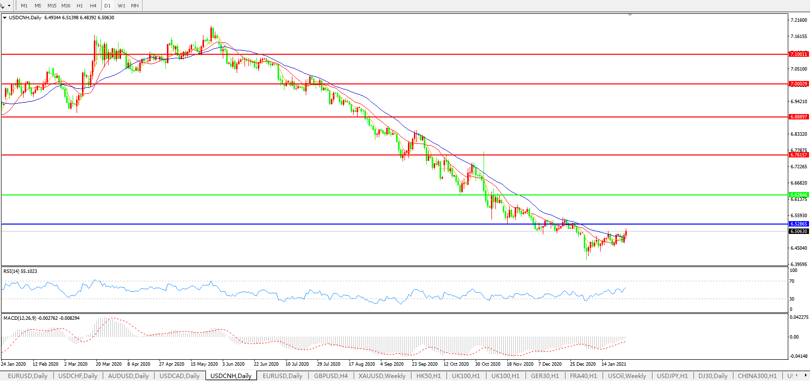 备选策略: 在6.6265之上,看涨,目标价位为6.7615,然后为6.8889。