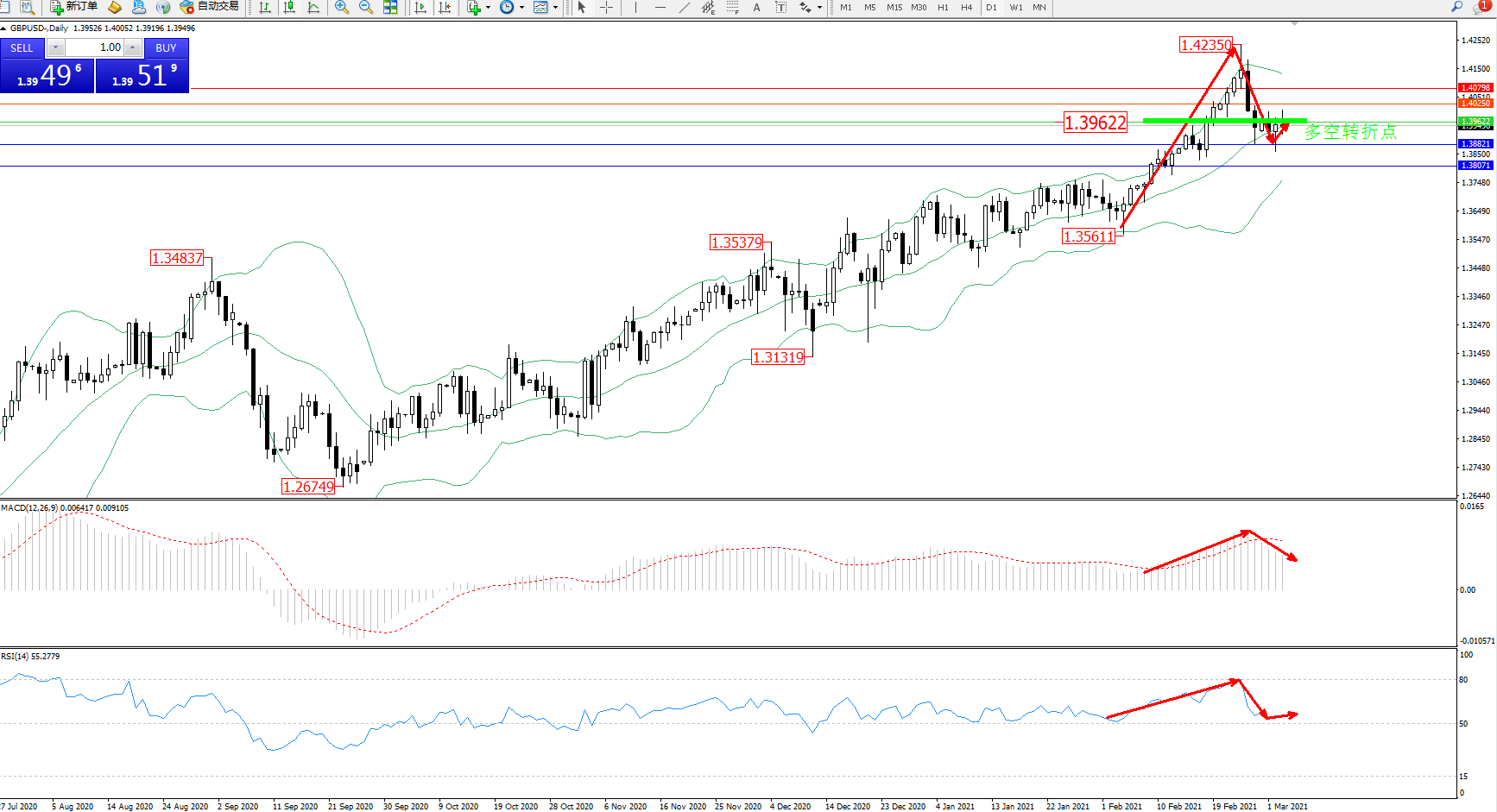 交易策略:1.39622下方看跌,目标1.38821、1.38071