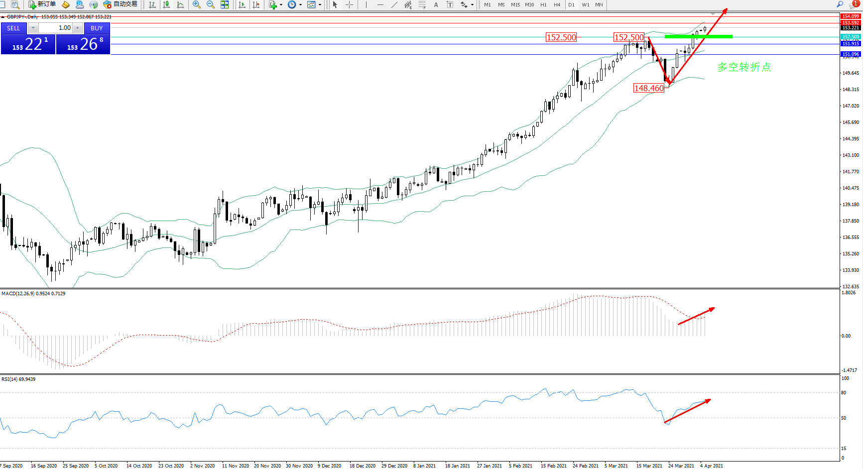 交易策略:152.500上方看涨,目标153.592、154.099