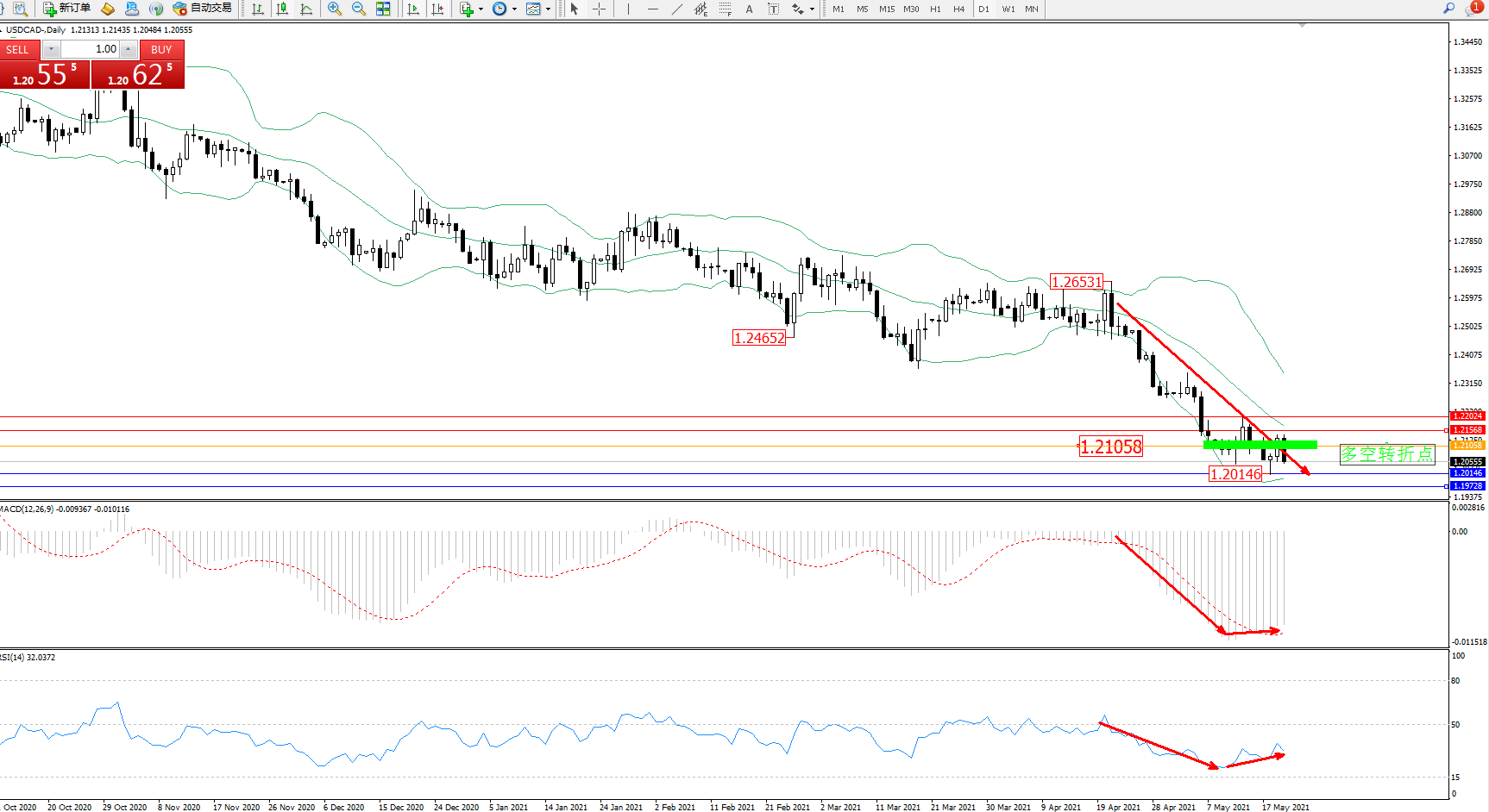 美元加元USDCAD——日K线图显示: