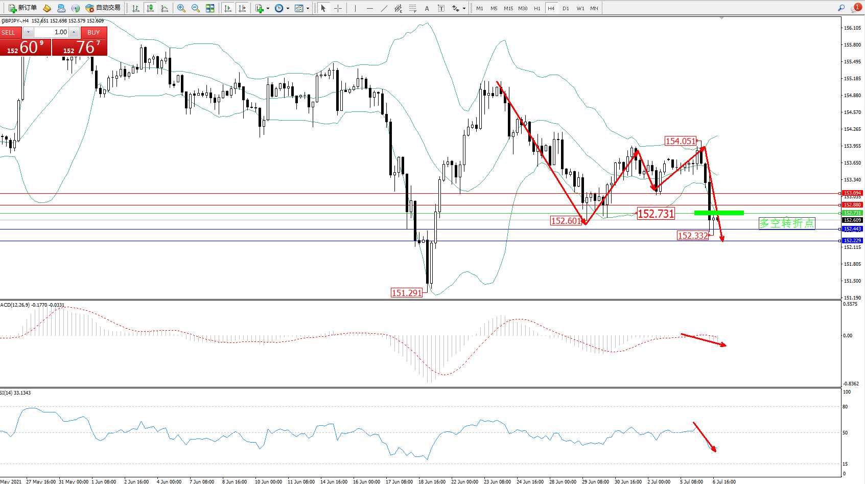技术点评:空头动力延续布林带指标通道中下轨区间持续震荡下行,触及152.601位置得到短期支撑反转震荡回升,但空头动力依旧强劲,再度急速下挫破布林带指标下轨附近节点抵达152.332附近短期震荡中,布林带指标呈张口走势持续中,短期或维持低位徘徊,MA CD指标处于0轴线附近弱势整理后开始下行中,RSI指标处于50均衡线附近窄幅徘徊后急速下挫至空头区域整理;