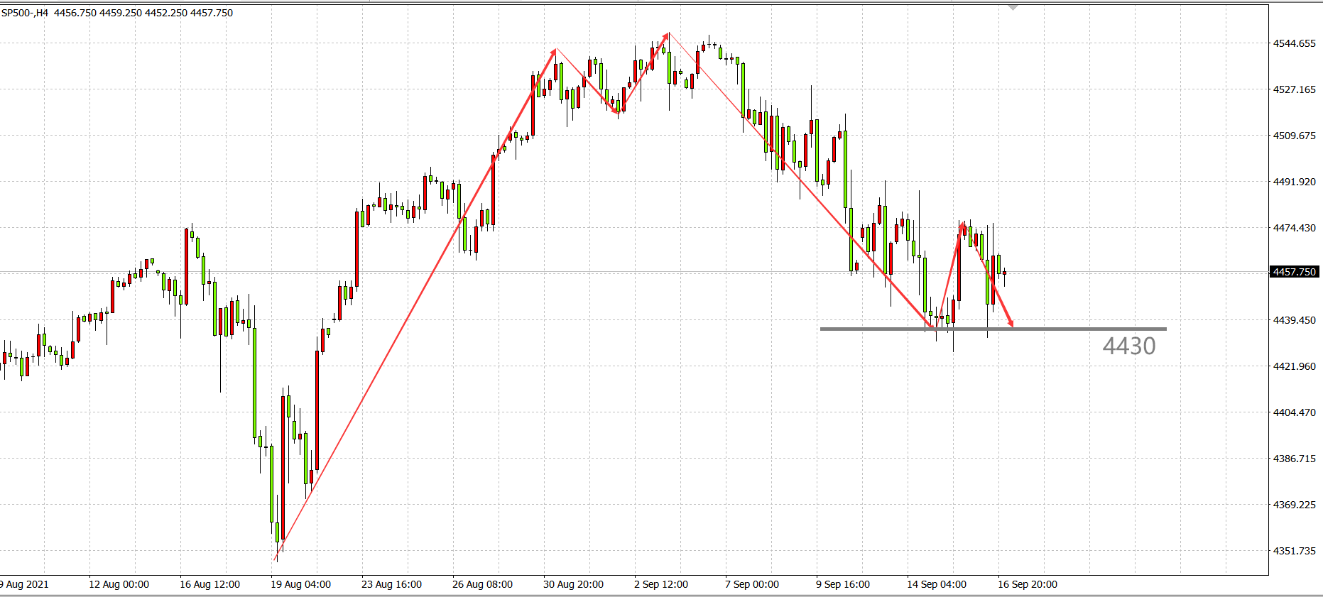 标普500指数4小时周期看,目前趋势已完成多空转换,短中期走势偏空头行情,目前4430是较明显支撑,昨日下探后迅速反弹,此价位是日内多空必争点位。