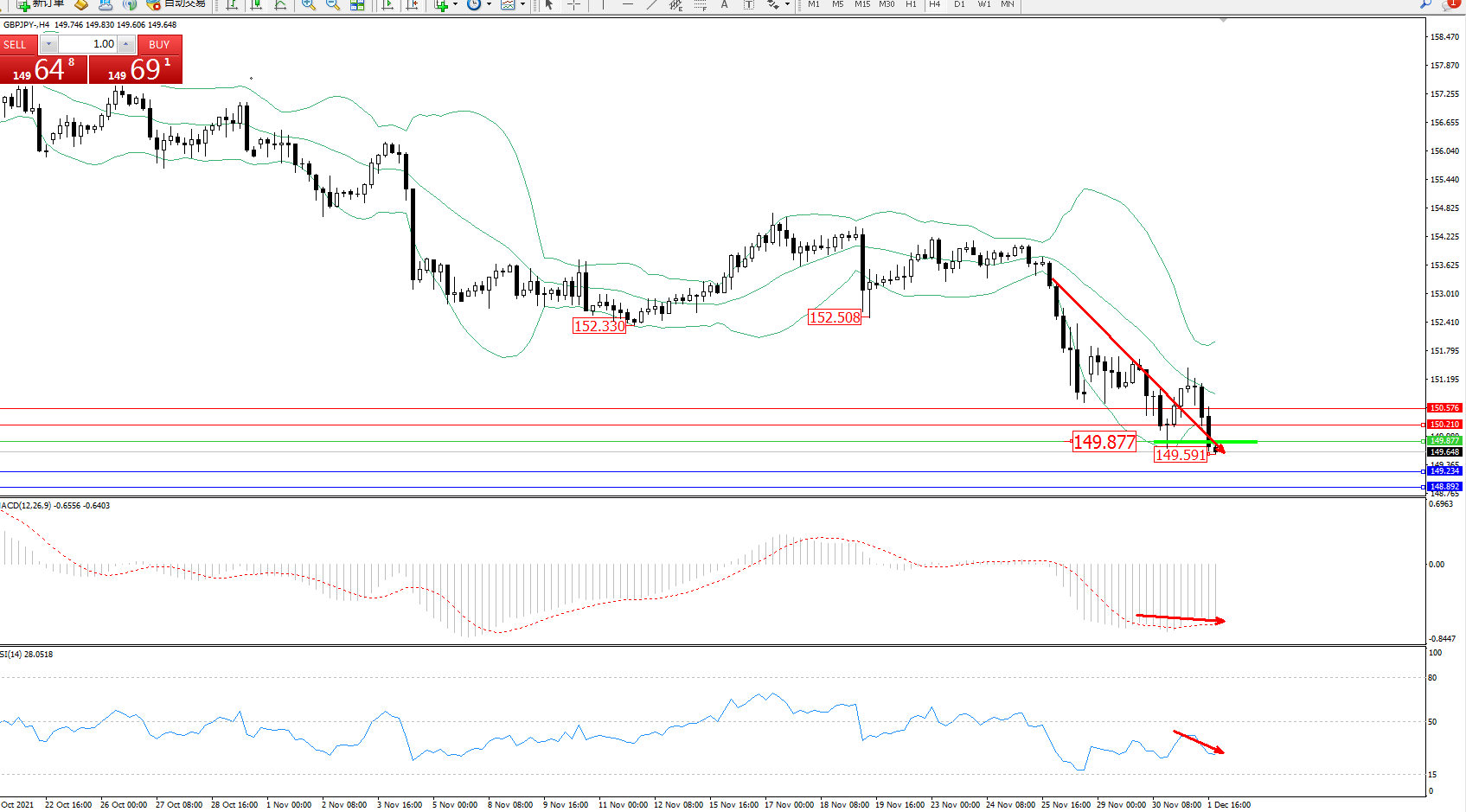 交易策略:149.877下方看跌,目标149.234、148.892