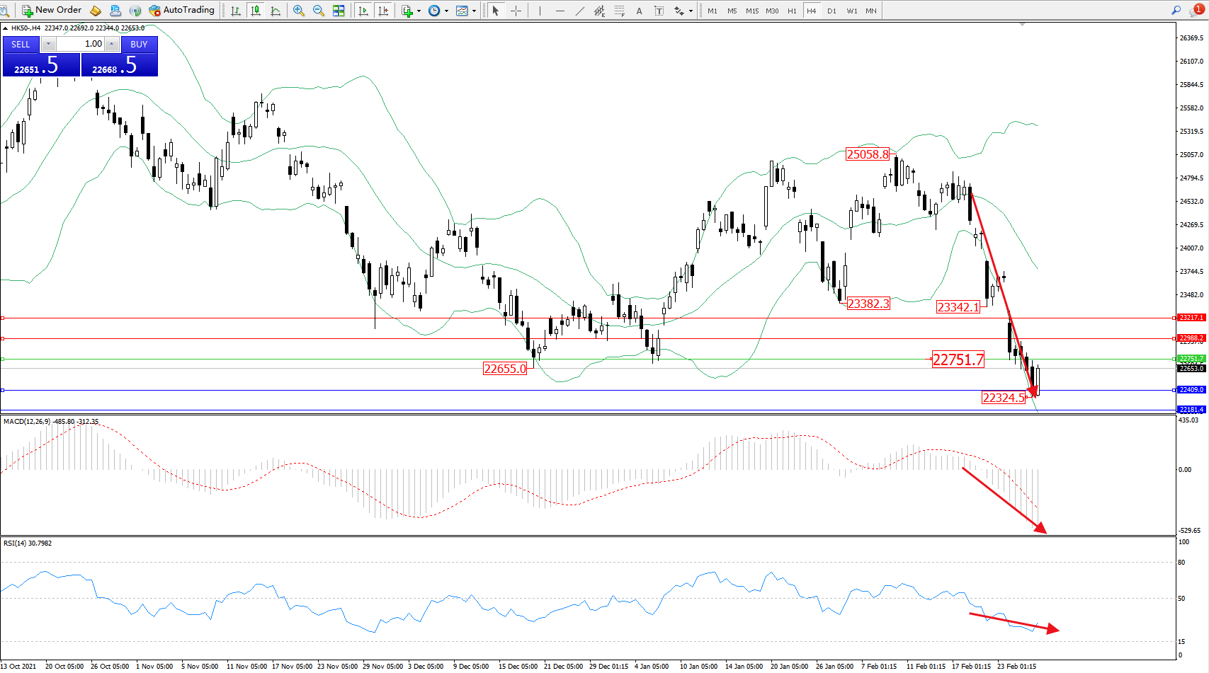 恒指HK50 ——4小时K线图显示: