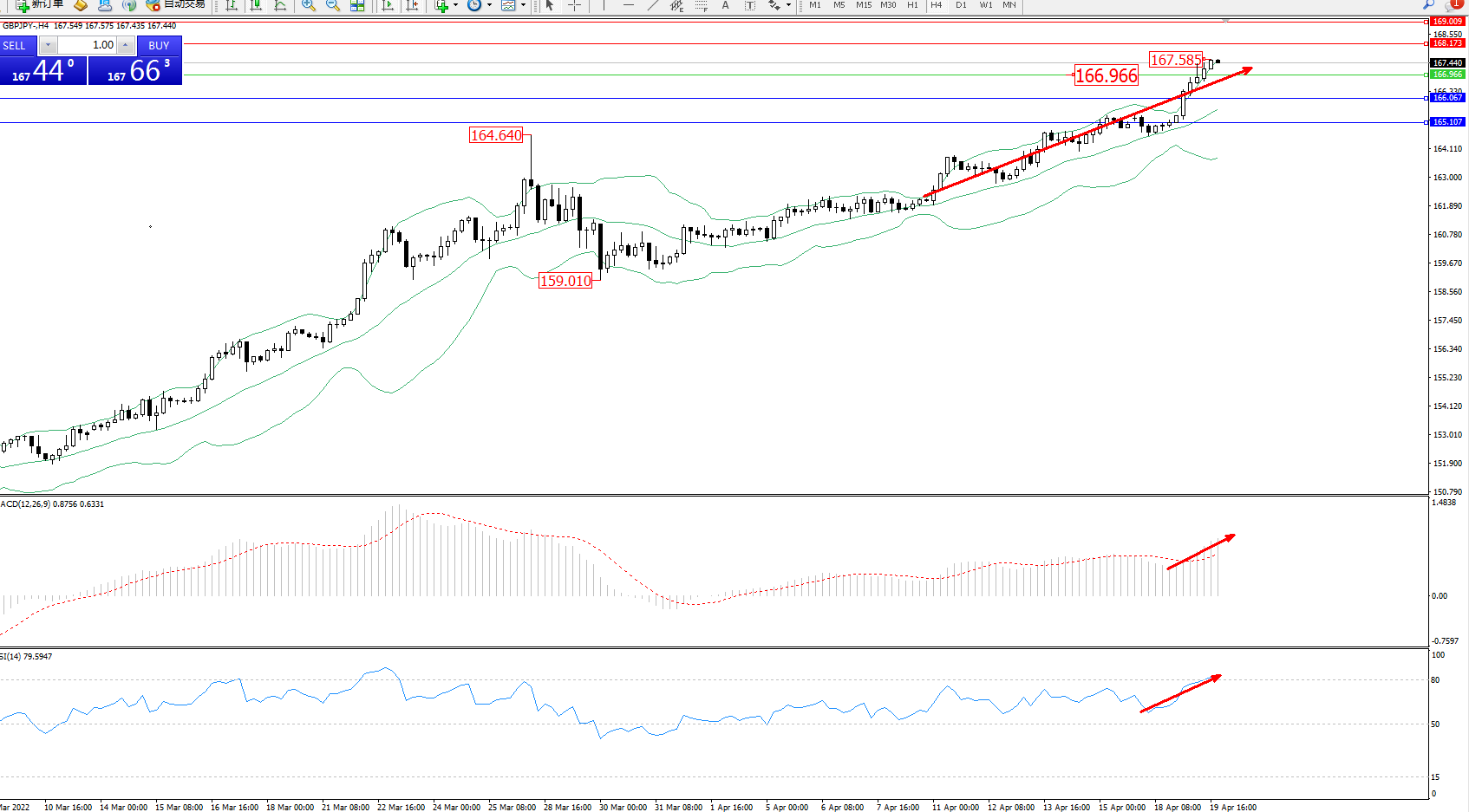 技术点评:多头动力延续布林带指标通道中上轨区间持续震荡上扬,高位抵达167.585附近节点后不断上扬,短期多头动力有继续攀升态势,布林带指标呈上行趋势走势后开始张口,MACD指标处于多头区域维持震荡上移中,RSI指标处于多头区域维持震荡上移至超买区80均衡线附近徘徊;