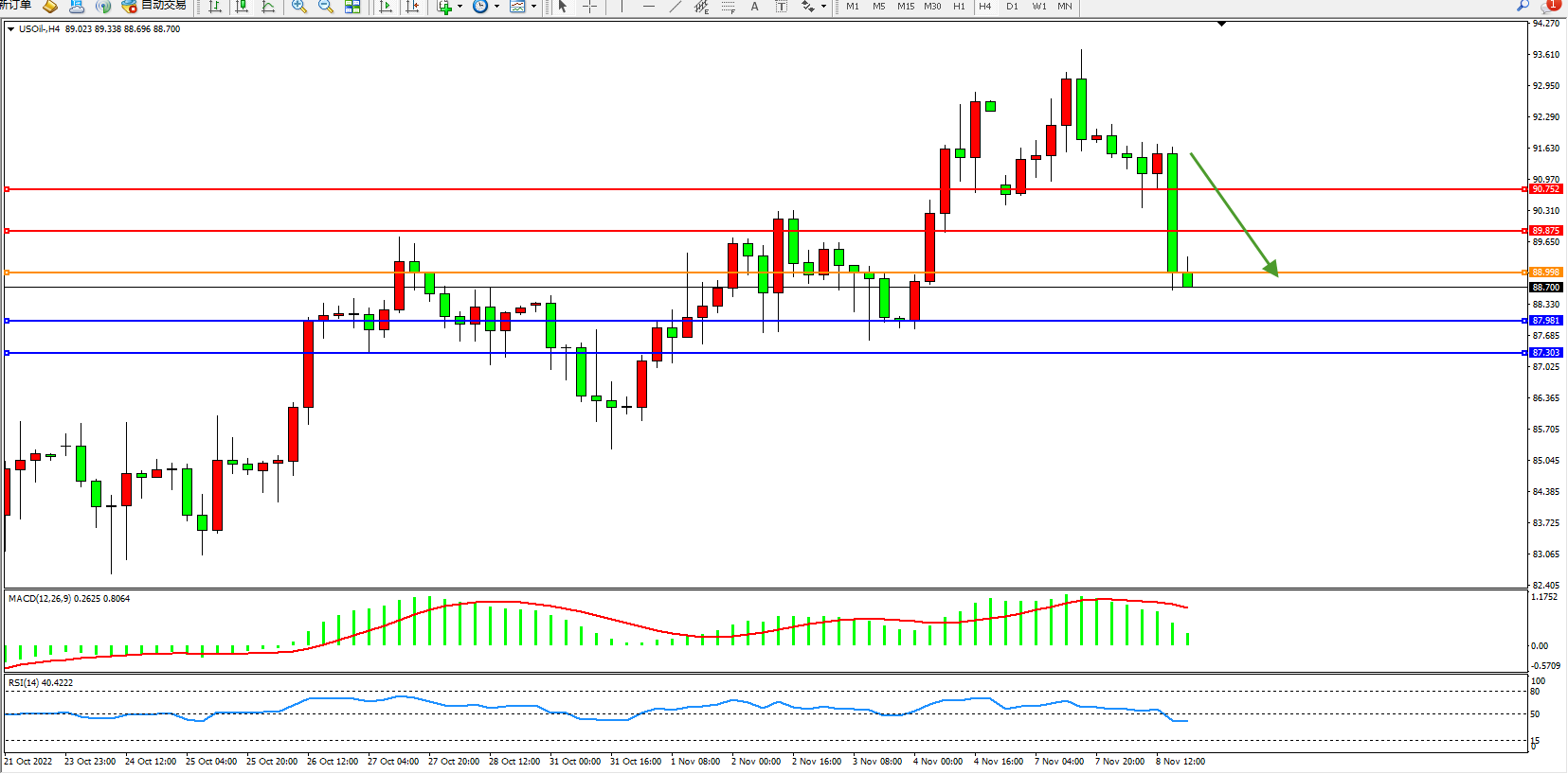 交易策略:88.998下方看跌,目标87.981、87.303