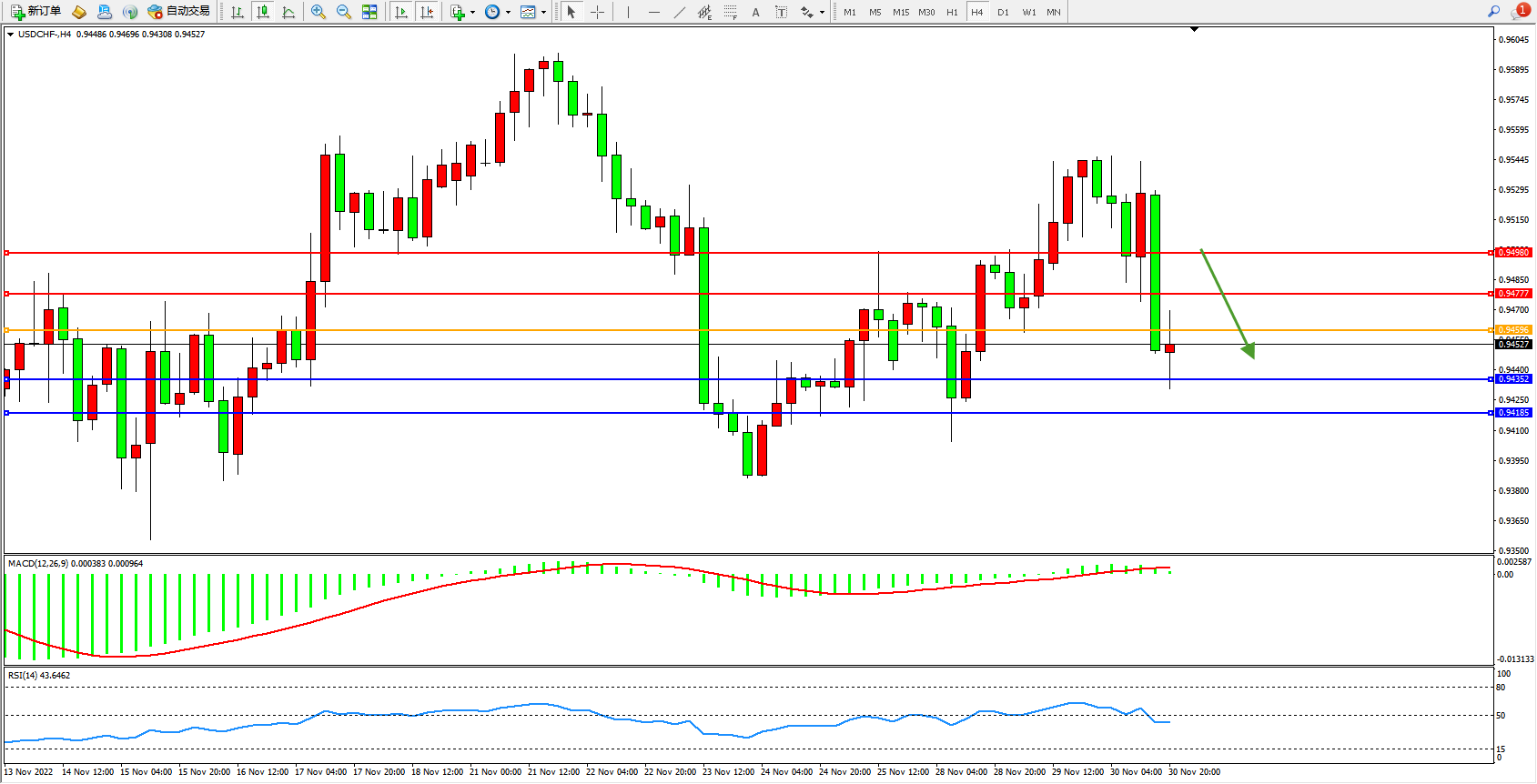 美元瑞郎USDCHF——4小时K线图显示: