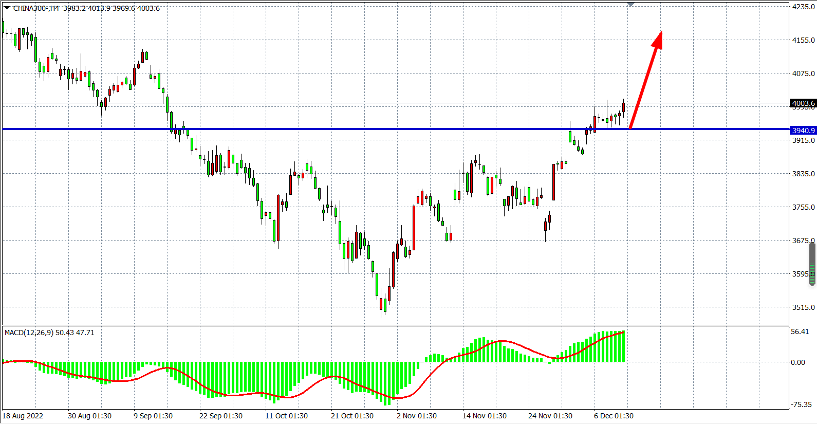 4小时图看,沪深3000走强至4000点之上,MACD于零轴之上持续走高,显示行情有进一步扩大涨幅需求,当前支撑上移至3940附近,在该位之上继续以看涨为主,上方目标4050-4100。