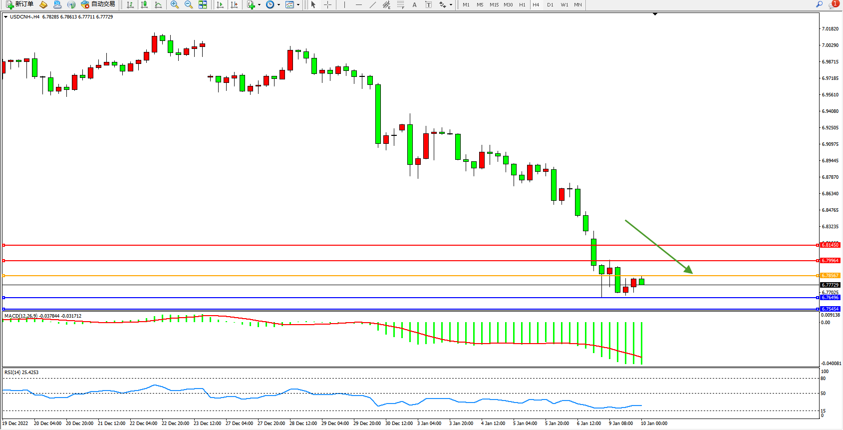 交易策略:6.78567下方看跌,目标6.76496、6.75454