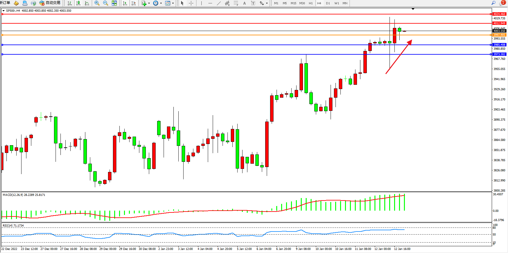 标普500指数1月12日(周四)收盘上涨13.63点,涨幅0.34%,报3983.24点;美国12月核心CPI月率温和上升,进一步证明价格压力正在缓解,并为美联储下月放慢加息步伐提供了空间。美国12月核心CPI月率录得0.3%,市场认为这一指标比总体通胀指标更能反映美国的潜在通胀。