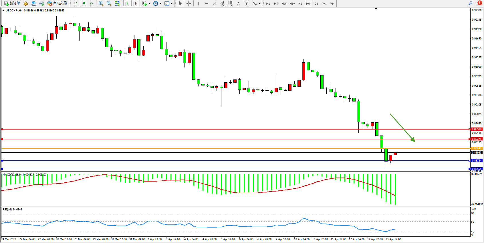 美元瑞郎USDCHF——4小时K线图显示:
