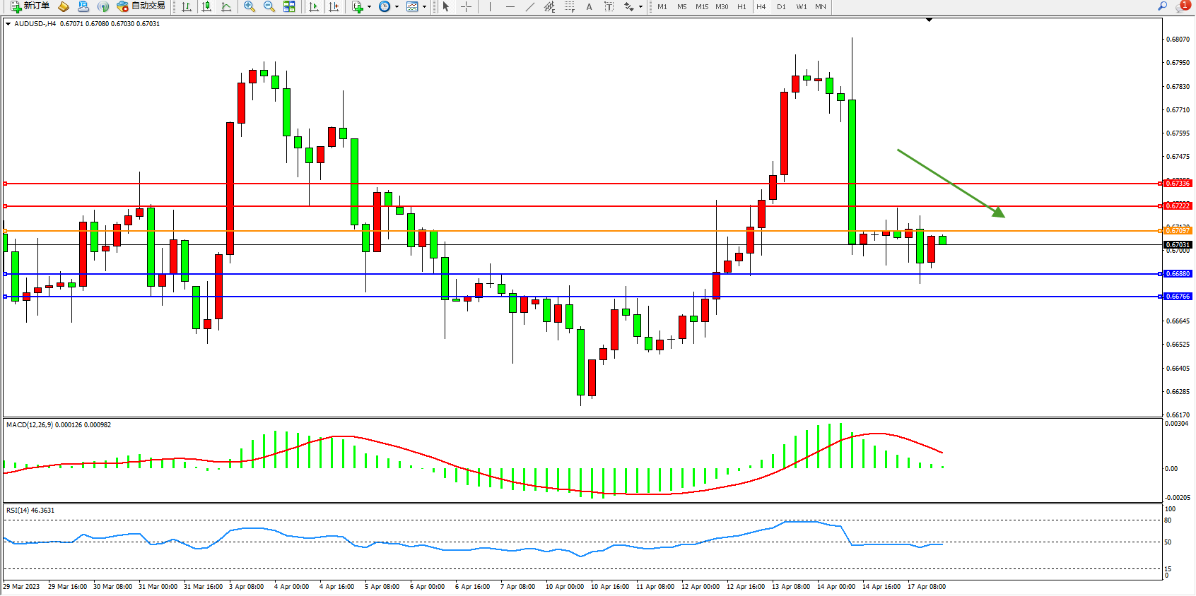 交易策略:0.67097下方看跌,目标0.66880 0.66766