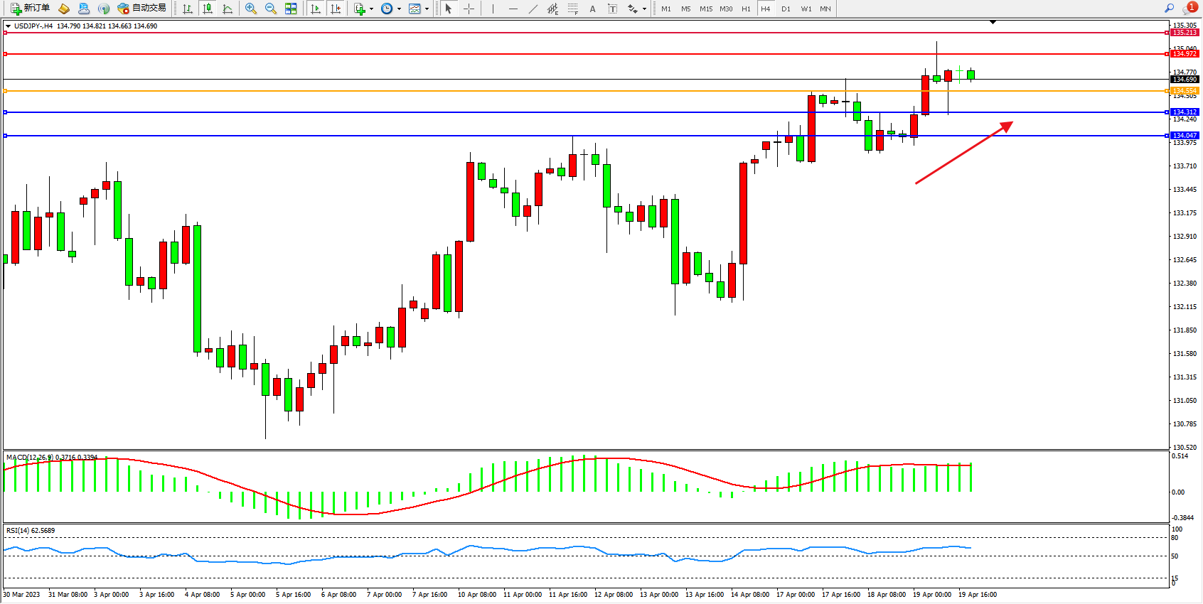 交易策略:134.554上方看涨,目标134.972  135.213