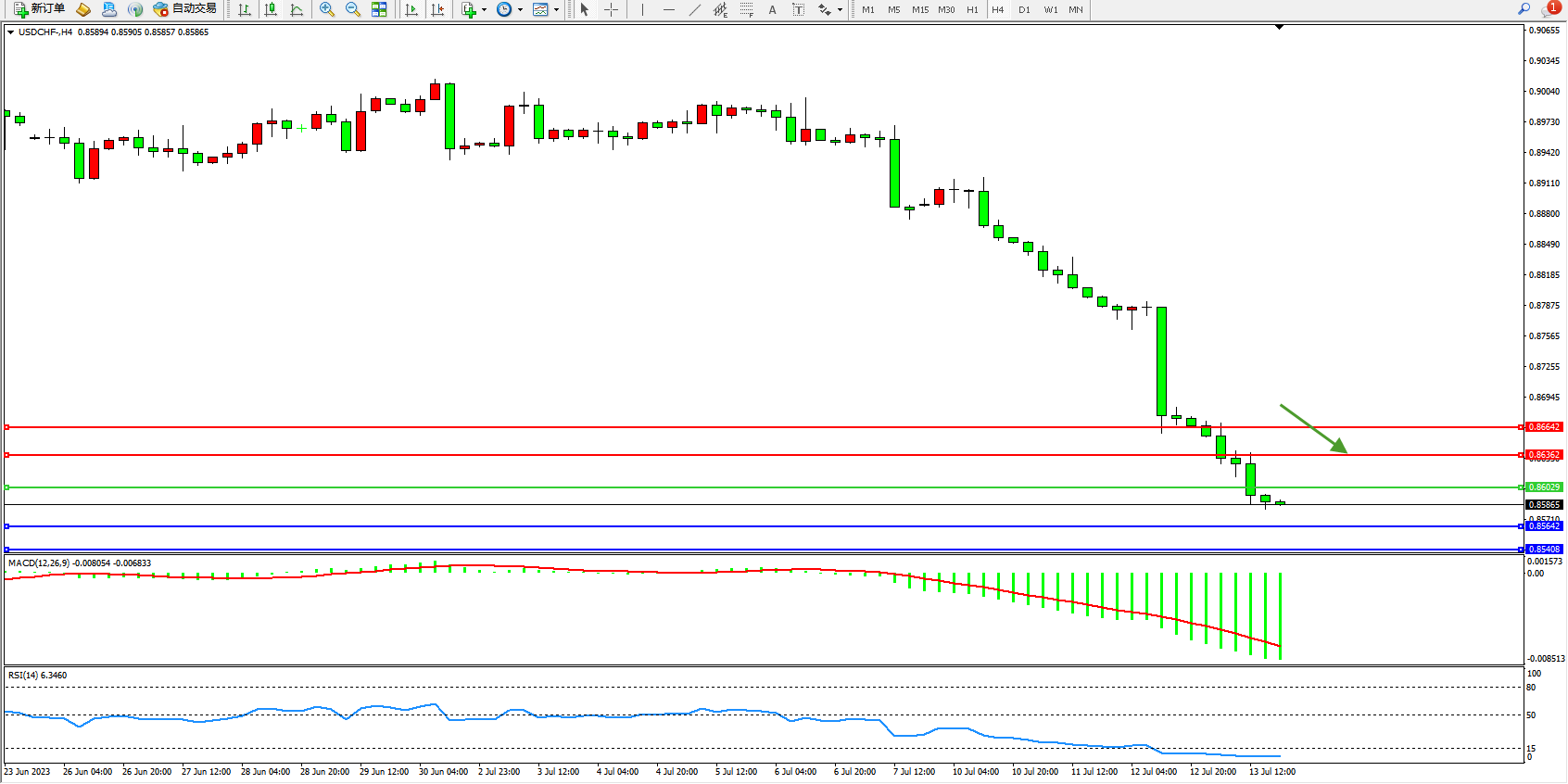 美元瑞郎USDCHF——4小时K线图显示: