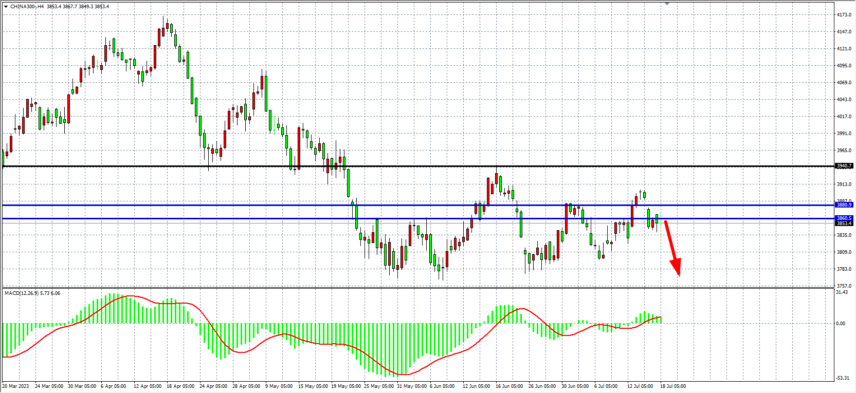 4小时图看,沪深300在3860附近盘整,MACD在零轴上缩量,行情进入窄幅盘整,当前支撑关注3800附近,上方压力3900-3940。