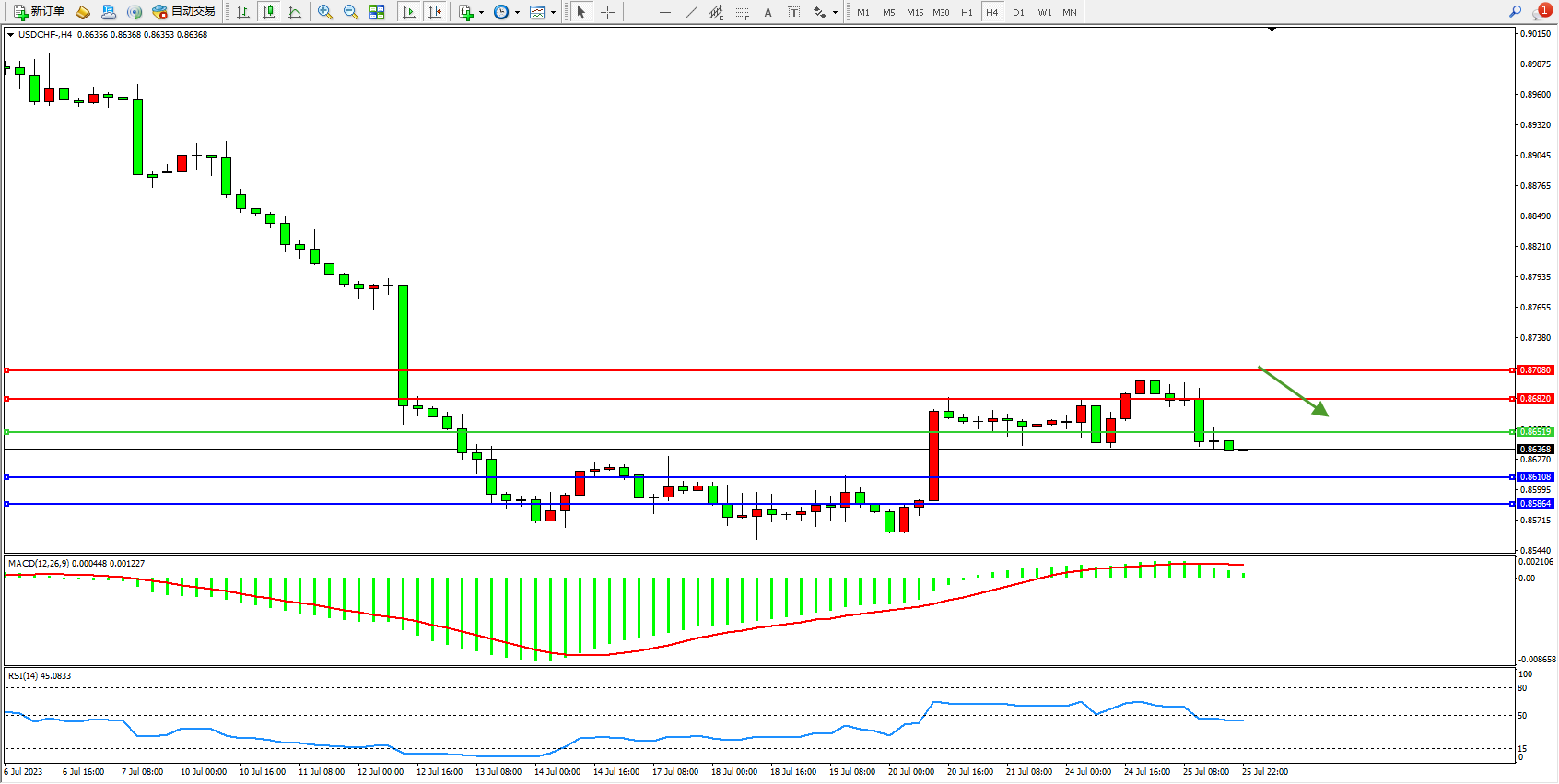 美元瑞郎USDCHF——4小时K线图显示: