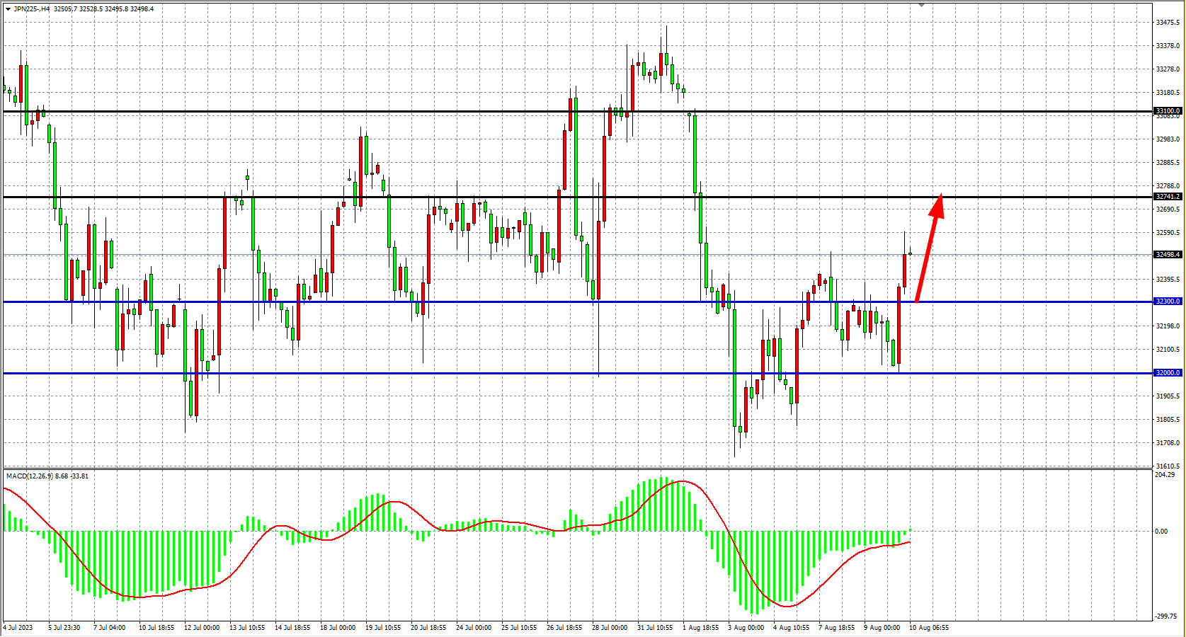 4小时图看,日经指数反弹进一步加大,MACD量能开始上穿零轴,短期趋势转向多头,支撑关注32300-32000,阻力关注32750-33100。