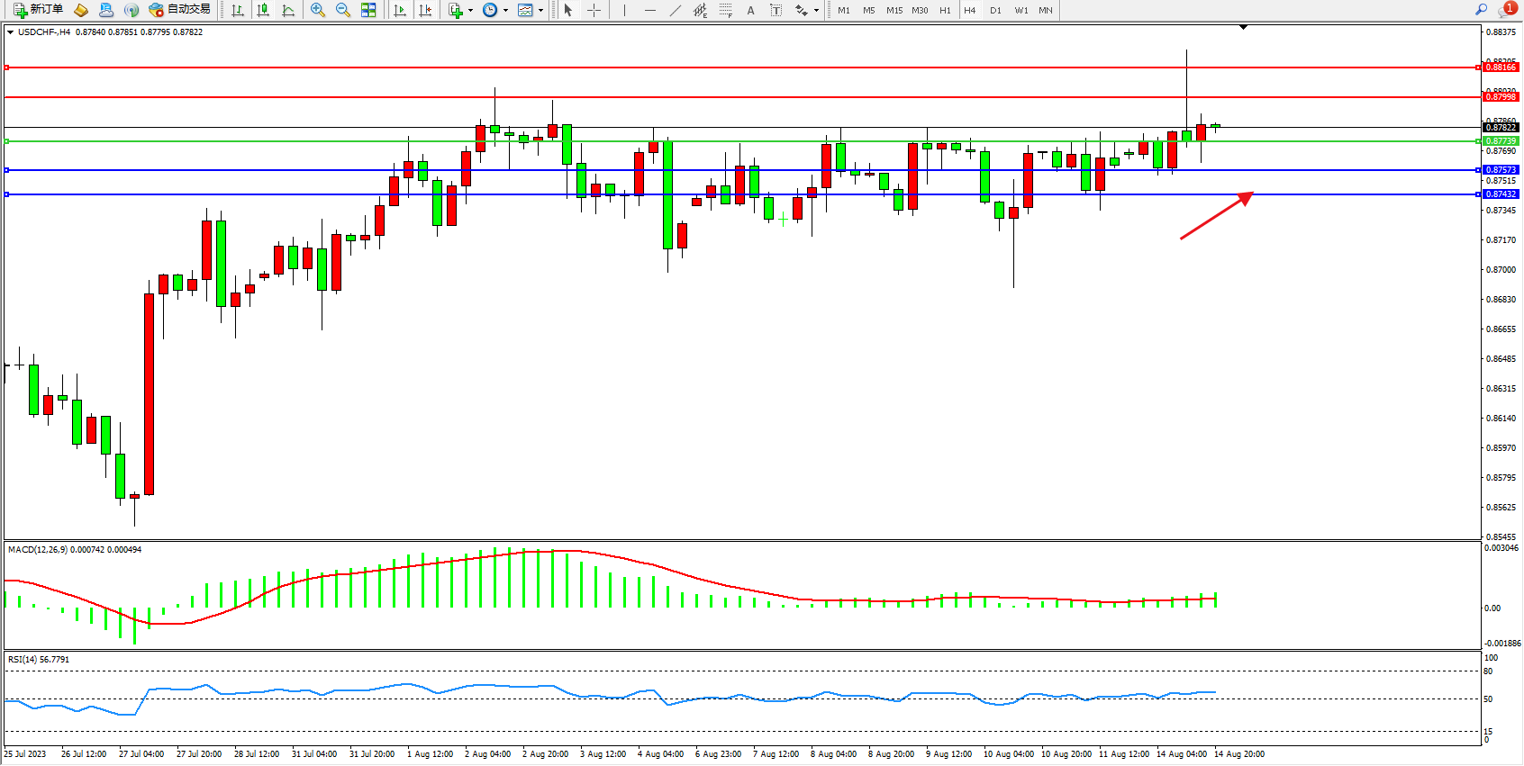 美元瑞郎USDCHF——4小时K线图显示: