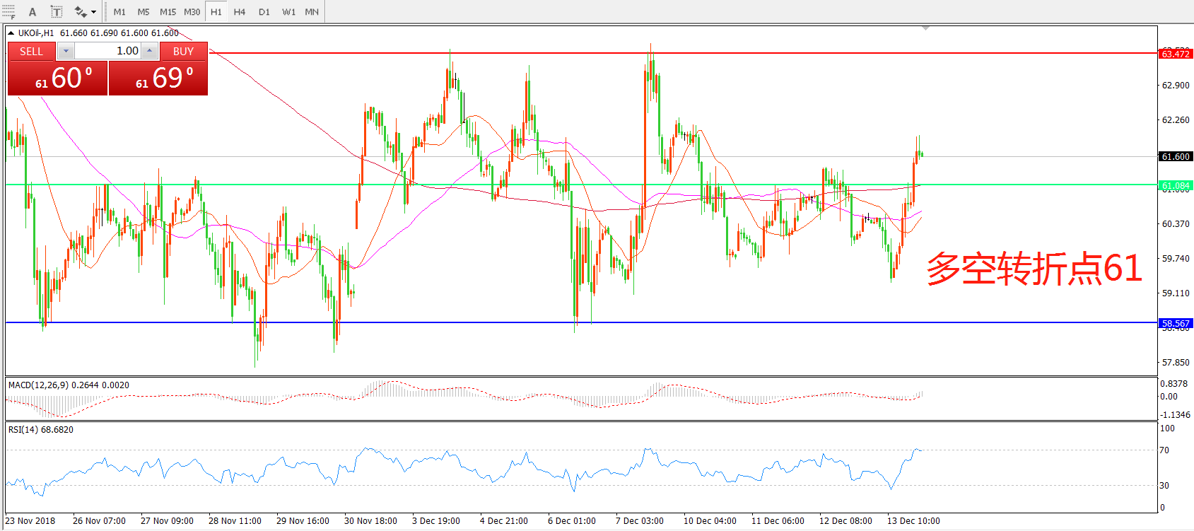 交易策略:在61.00之下看跌,目标58.00    55.00