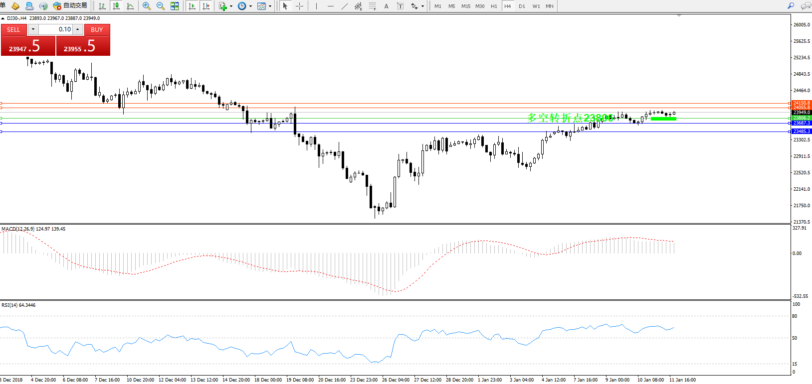 道琼斯指数DJ30—— 4小时K线图显示:
