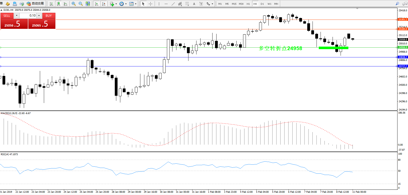 道琼斯指数DJ30—— 4小时K线图显示: