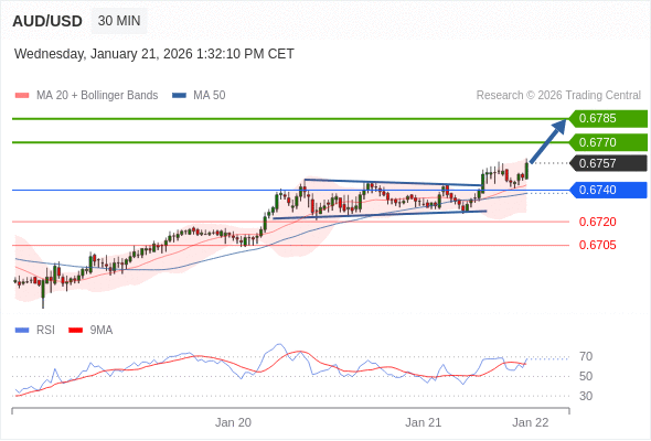 在 0.6740 之上,看涨,目标价位为 0.6770 ,然后为 0.6785 。