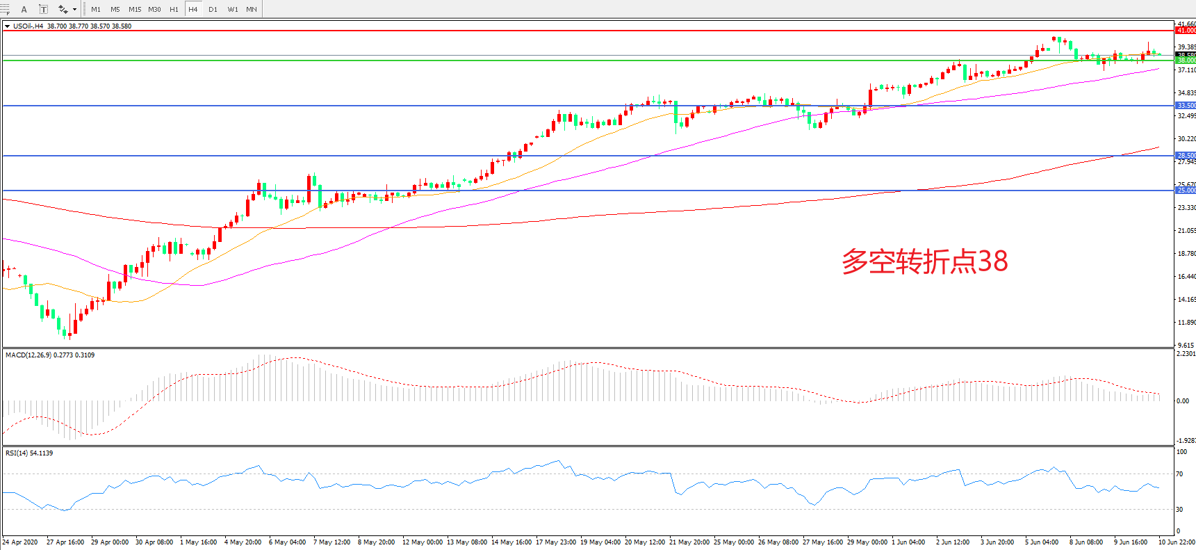4小时图看,油价延续高位震荡,多空博弈十分胶着,38美元一线成为短期多空分水岭,均线系统走平,MACD红柱减少,RSI指标走平,日内延续震荡概率较大。