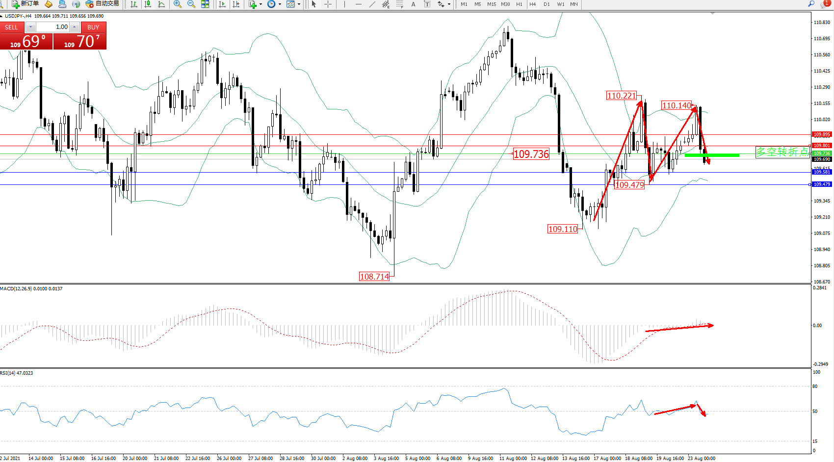 交易策略:109.736下方看跌,目标109.581、109.479