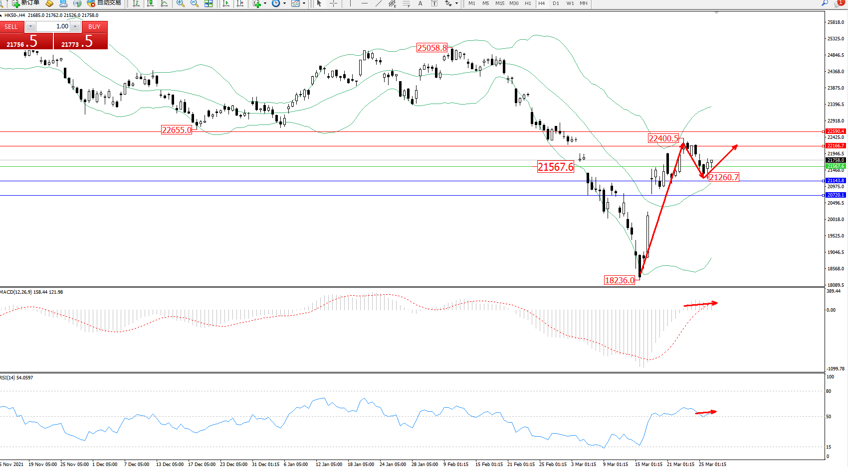 恒指HK50 ——4小时K线图显示: