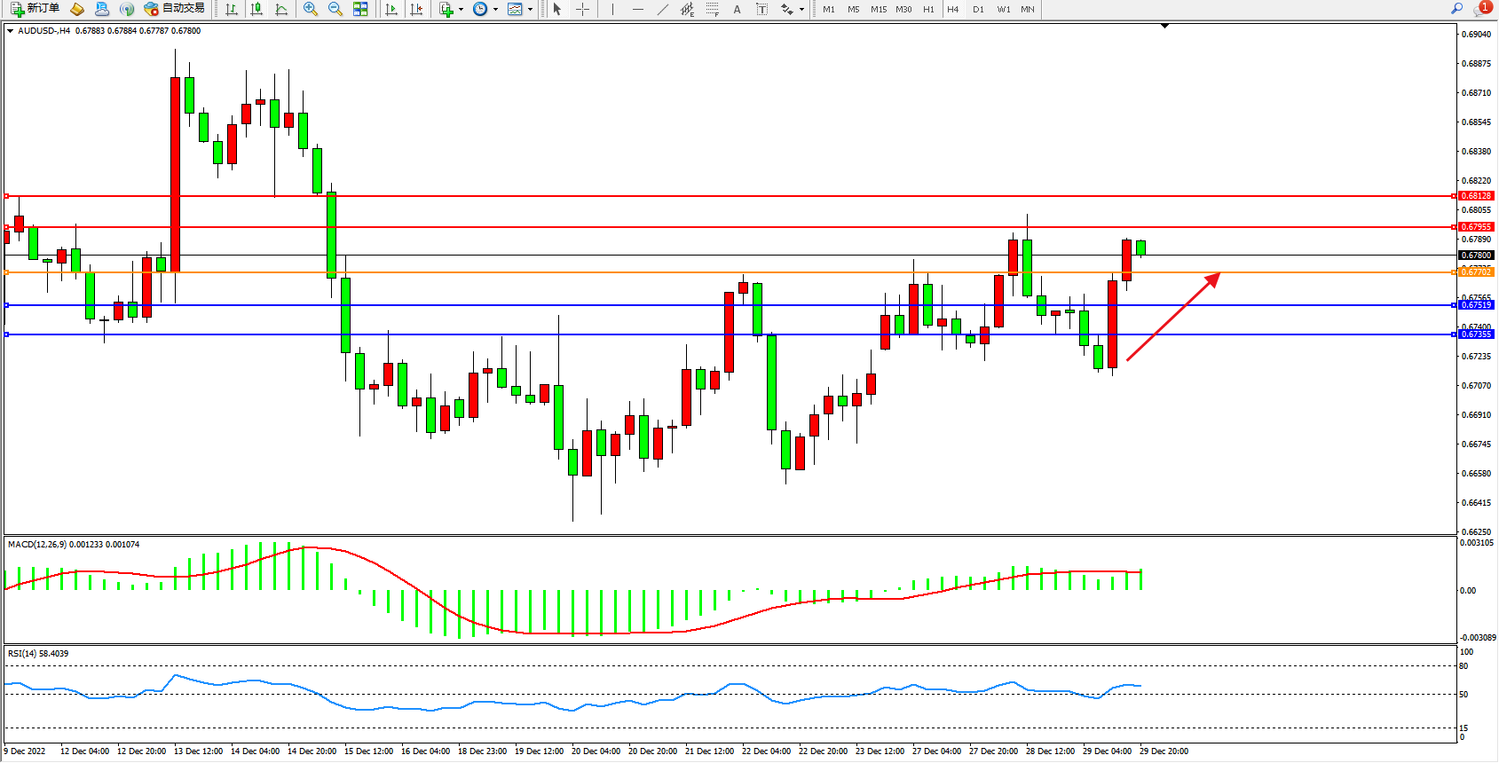 交易策略:0.67702上方看涨,目标0.67955、0.68128