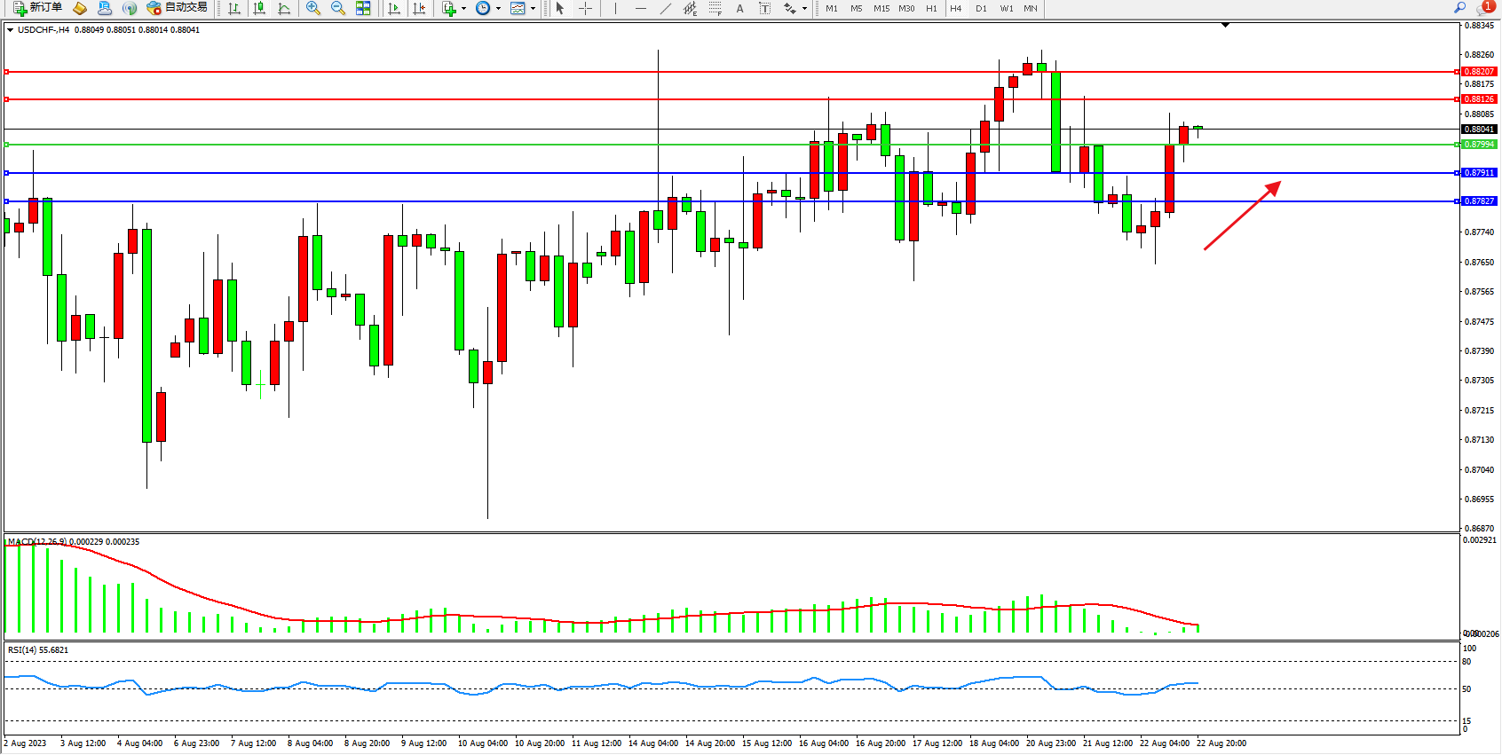 美元瑞郎USDCHF——4小时K线图显示:
