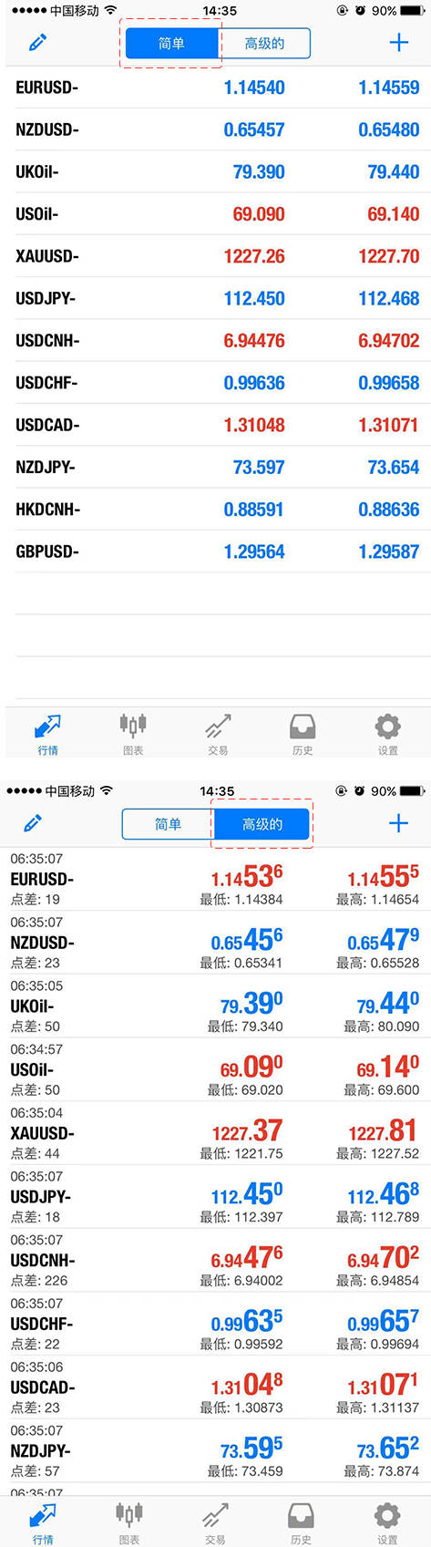 1.在行情界面中点击“简单”和“高级的”,进行切换。